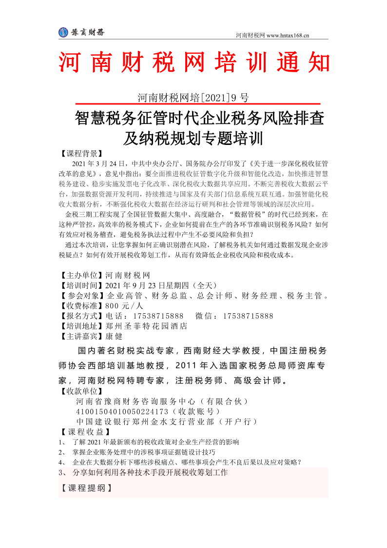 智慧税收征管时代企业风险排查及纳税规划专题培训