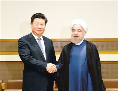 图为:国家主席习近平2015年9月28日在纽约会见伊朗总统鲁哈尼。