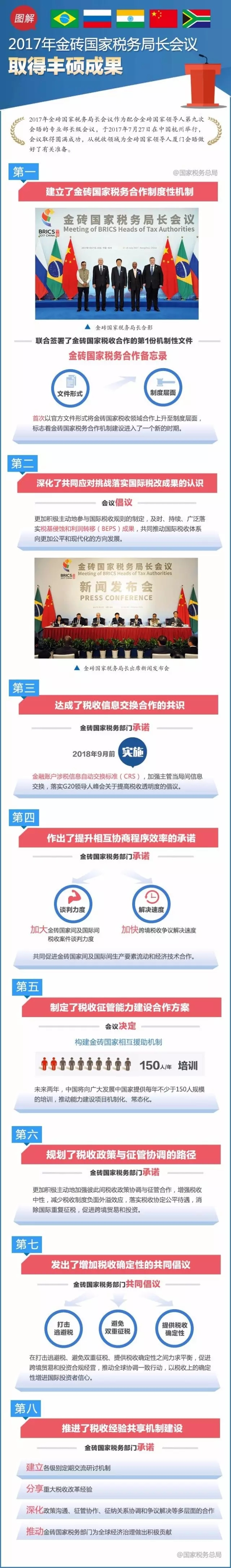 2017年金砖国家税务局长会议作为配合金砖国家领导人第九次会晤的专业部长级会议,于2017年7月27日在中国杭州举行,会议取得圆满成功,从税收领域为金砖国家领导人厦门会晤做好了有关准备。会议取得哪些成果?戳图了解